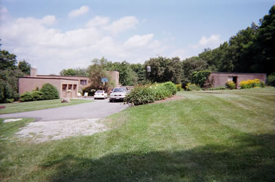 The first view of the house as we round the corner shows a low, flat-roofed