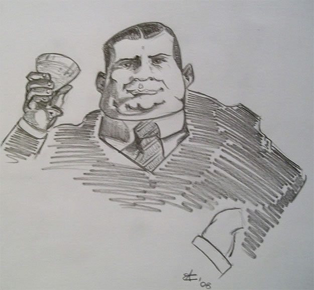 Mass of dark brown hair, very little greying, is not parted but sweeps off to the right because he brushes with his right hand. Dark brown eyes are average in size, but look smaller because they are mostly half closed. They always are aimed straight at the person he is talking to. Forehead is high. Head and face are big but do not seem so in proportion to the whole. Ears rather small. Nose long and narrow, slightly aquiline. Mouth mobile and extremely variable; lips when pursed are full and thick, but in tense moments they are thin and their line is long. Cheeks full but not pudgy; the high point of the cheekbone can be seen from straight front. Complexion varies from some floridly after meals to an ivory pallor late at night when he has spent six hard hours working on someone. He breathes smoothly and without sound except when his is eating; then he takes in and lets out great gusts of air. His massive shoulders never slump; when he stands up at all he stands straight. He shaves every day. He has a small brown mole just above his right jawbone, halfway between the chin and the ear.