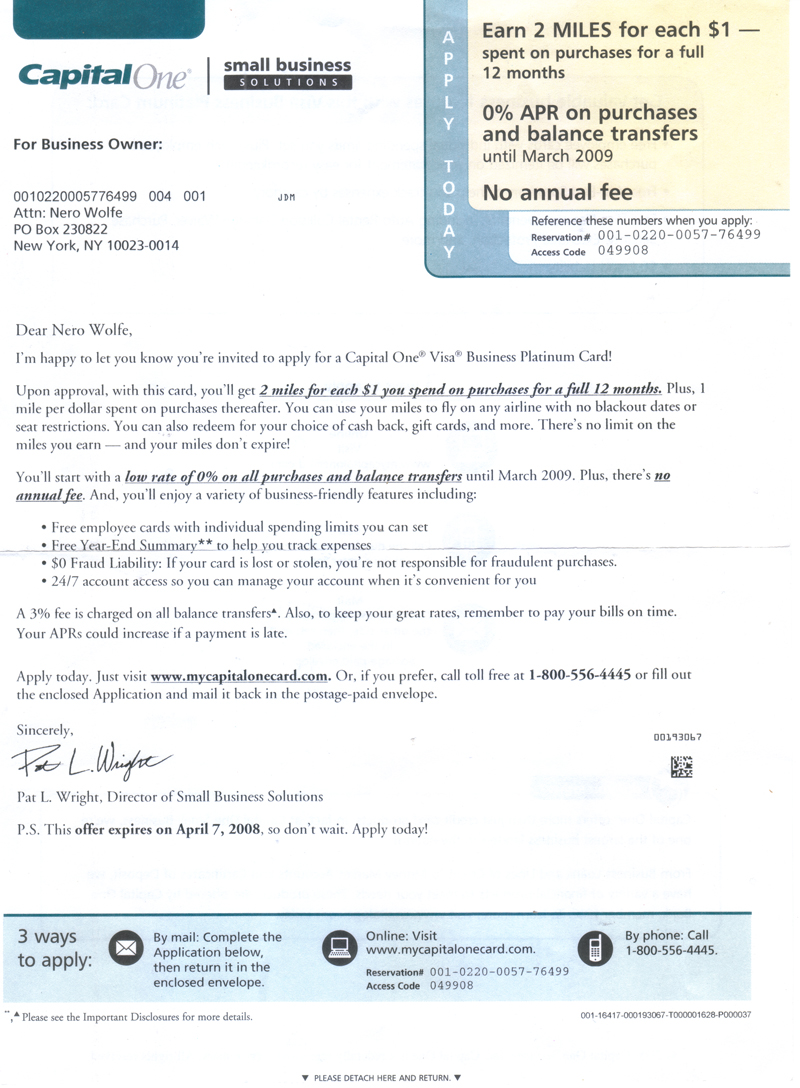 In 2008, at the Wolfe Pack post office box a letter arrived from the Financial Institution, Capital One, addressed to Nero Wolfe. Inside was a letter pitching a credit card. The salutation was "Dear Nero Wolfe." If a major financial institution and the US Postal Service both acknowledge Mr. Wolfe's existence, who are we to disagree? I say it is about time our government got something right.